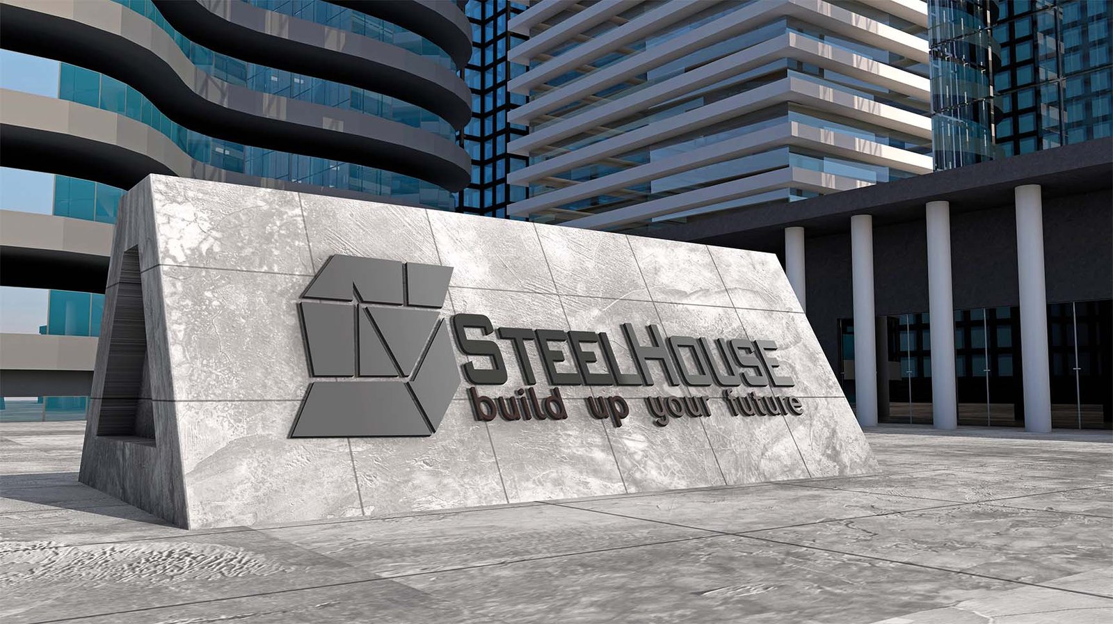 Le pictogramme évoque un building d’acier et de verre, et la liberté de formes que permet l’emploi de ces matériaux dans l’architecture contemporaine. La police Bank Gothic Medium s’accorde avec la solidité des structures acier (steel en anglais).